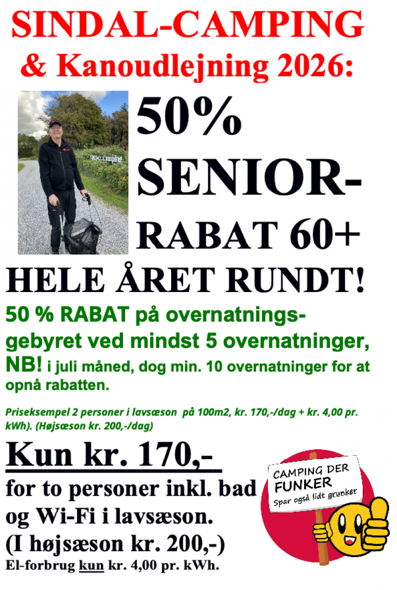 Senior 60+ och pensionärsrabatt på 50% av övernattningsavgiften vid minst 5 dagars vistelse året runt – förutom i juli då minst 10 dagars vistelse krävs.