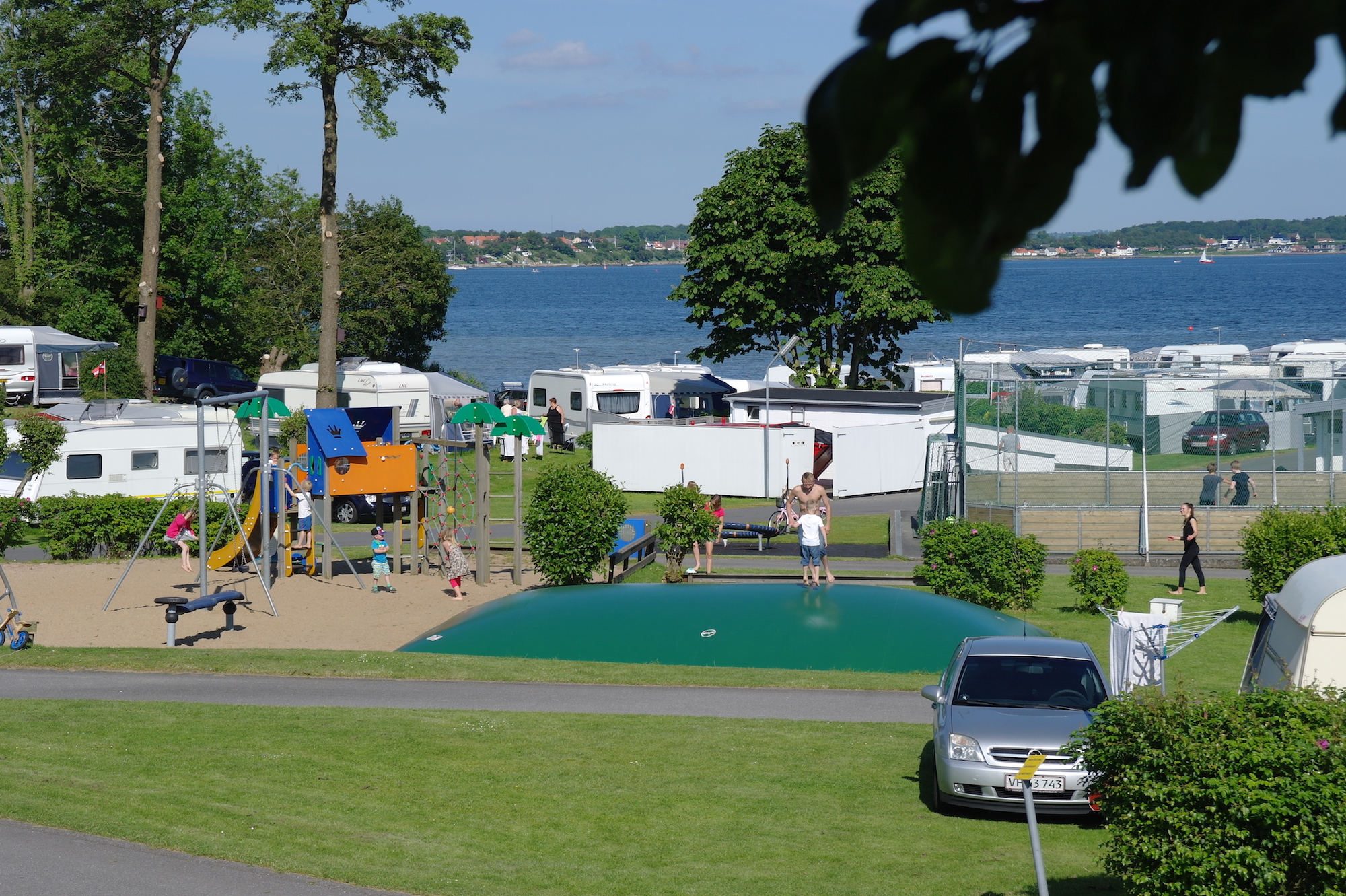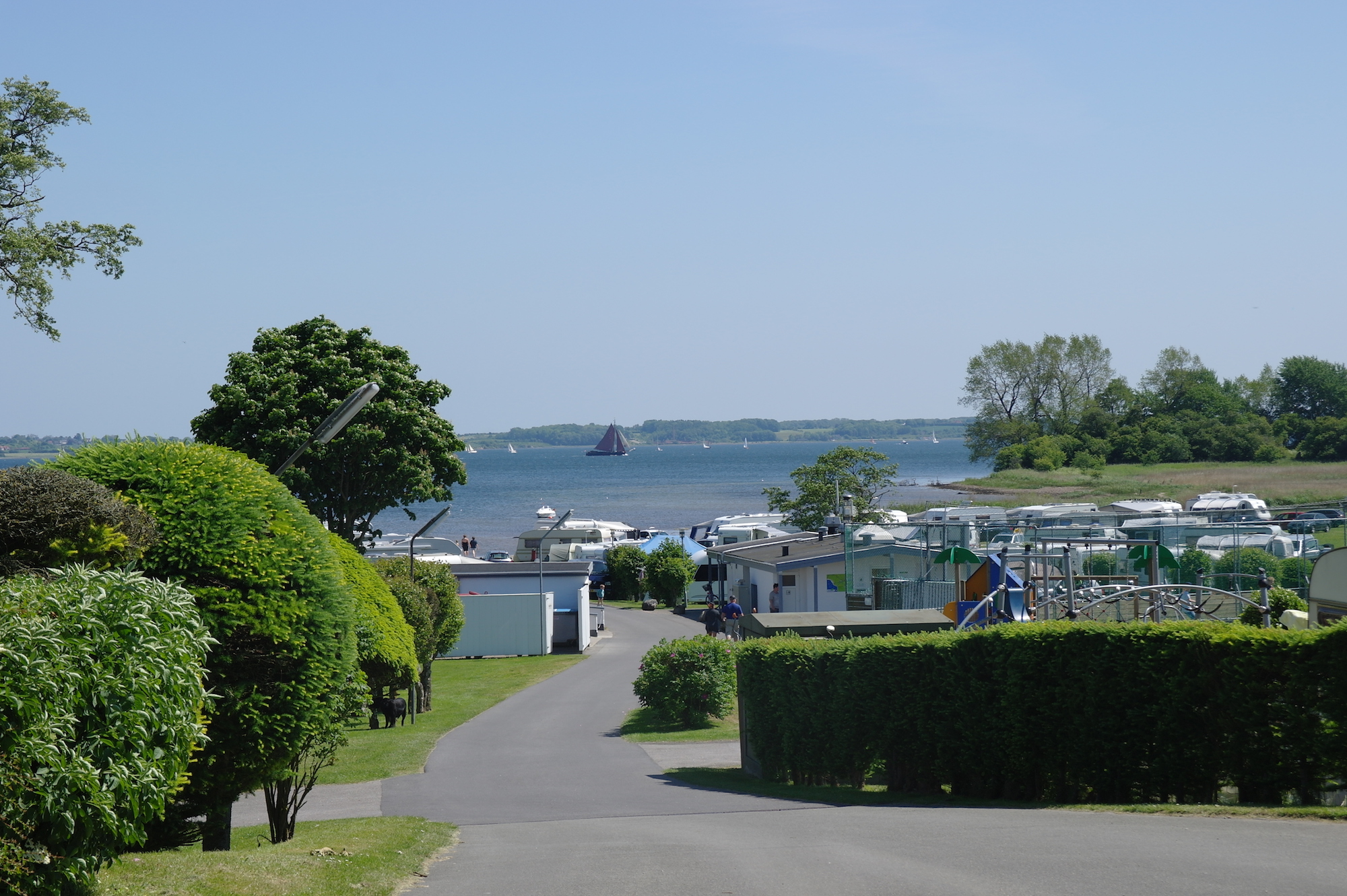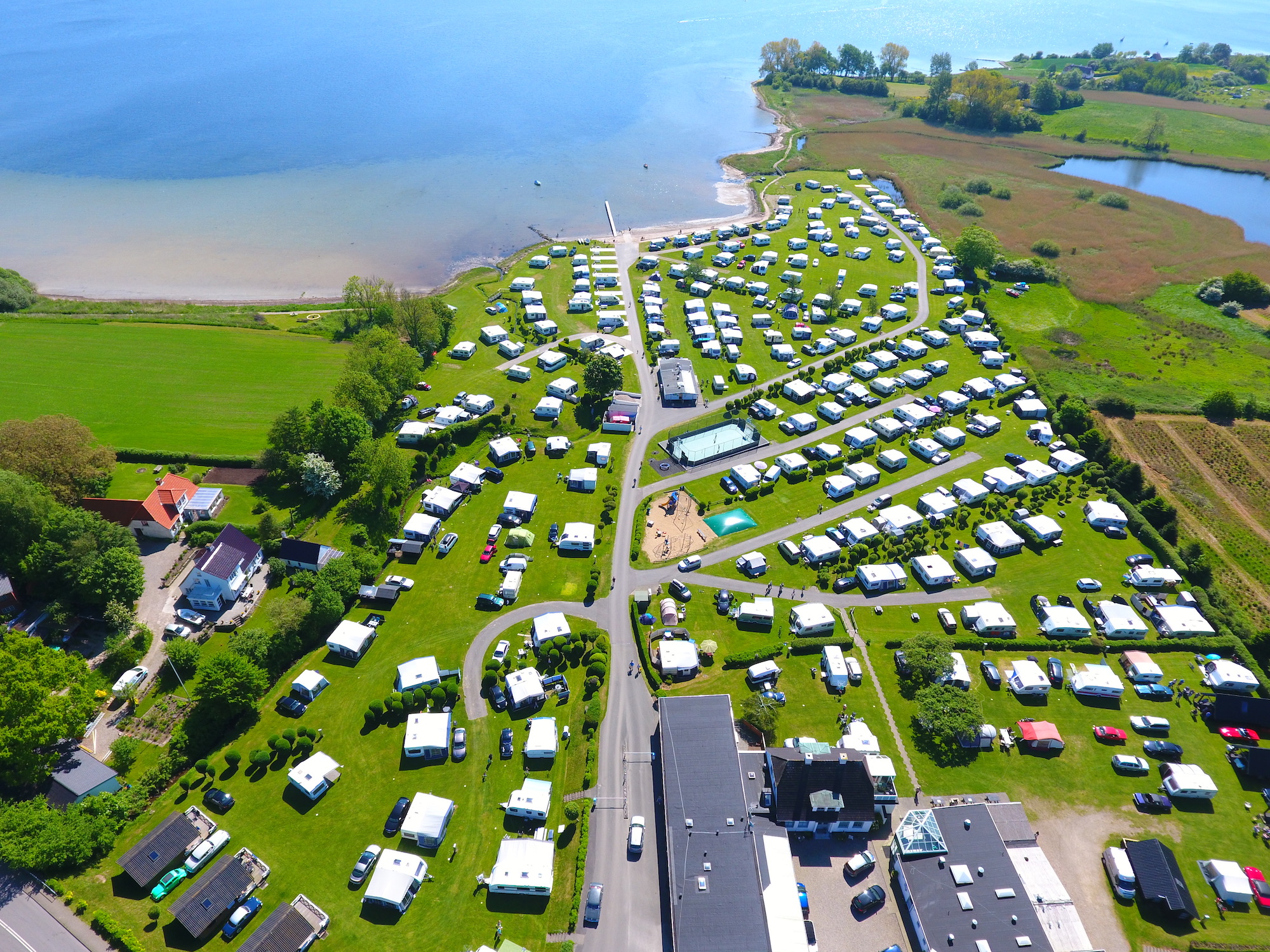 Platsen ligger på en sluttande mark som gränsar till campingens egen lilla strand vid Flensborg Fjord.
