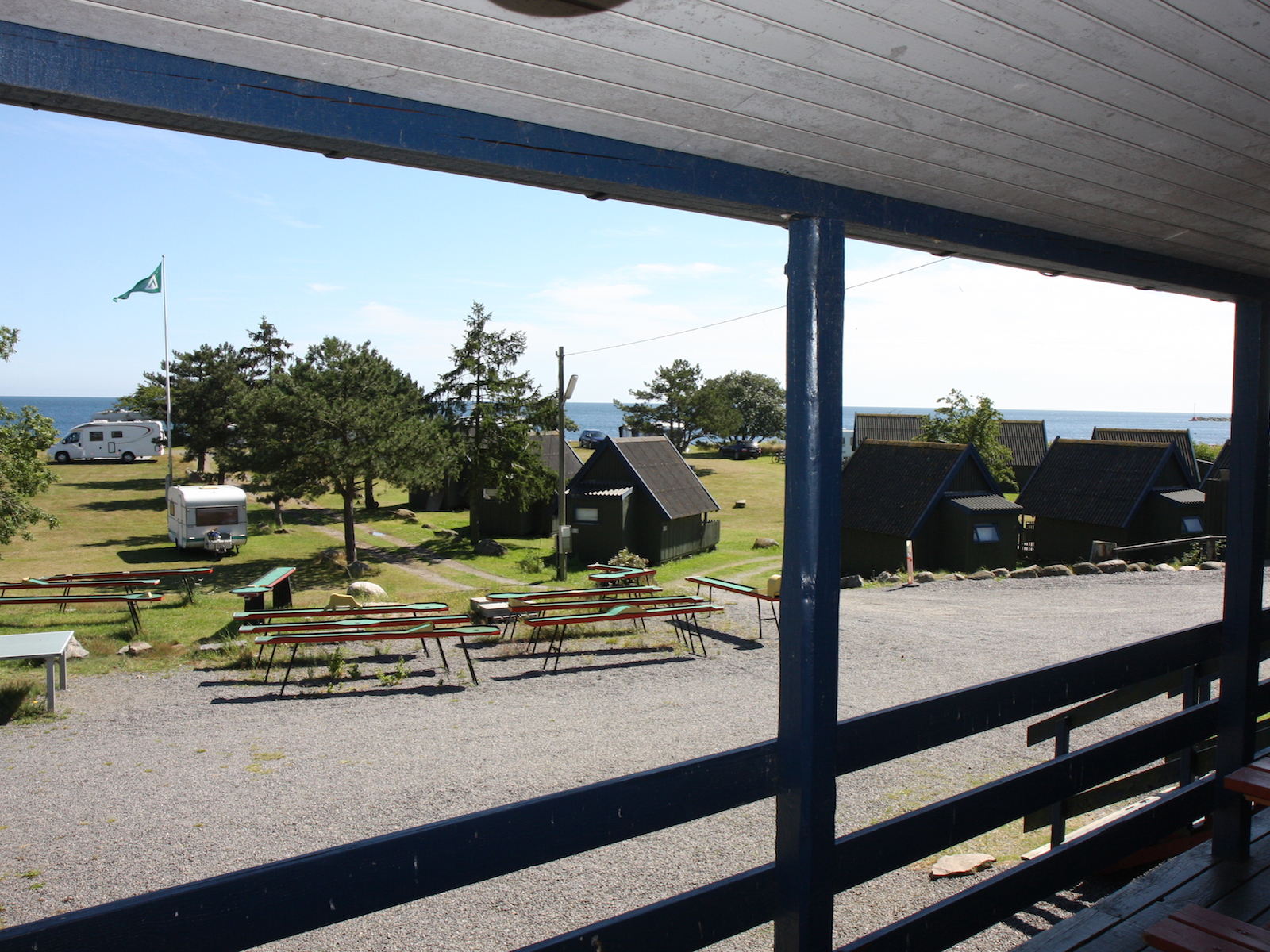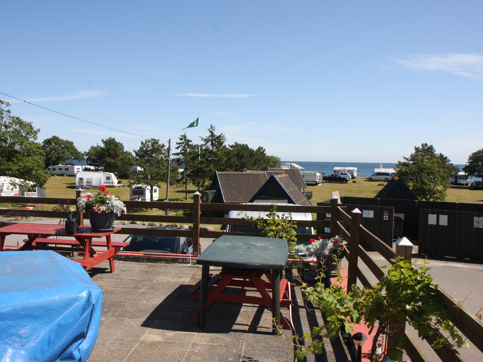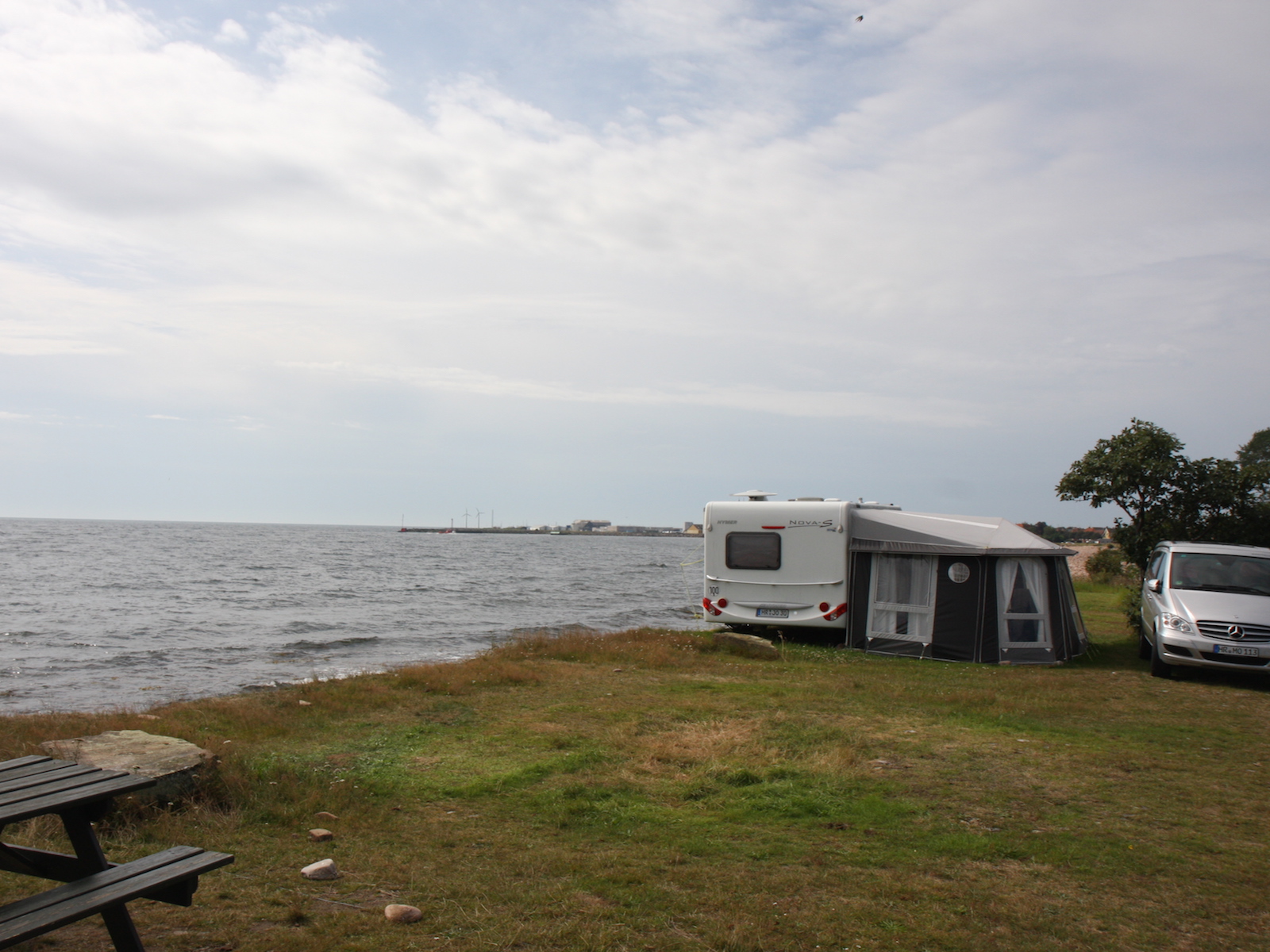 Det tillkommer ingen extra avgift för havsutsikt. Här gäller först till kvarn. Platserna kan vara bokade, men vi fick en fin plats med utsikt över Nexø Hamn och mycket vatten. Vi kunde ha fått en plats alldeles vid vattnet, där det ibland stänker upp på platsen.