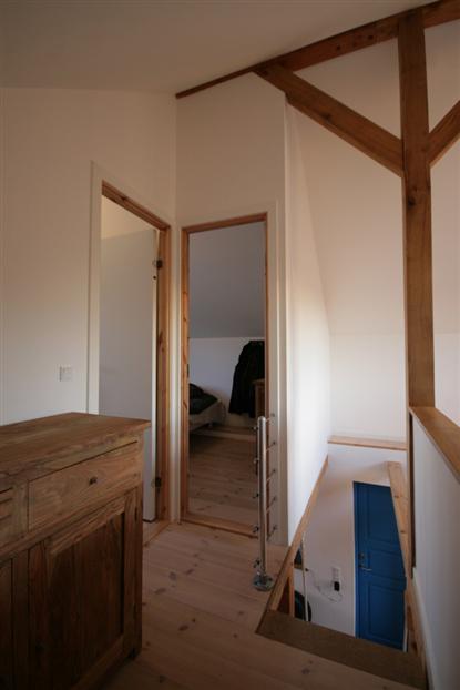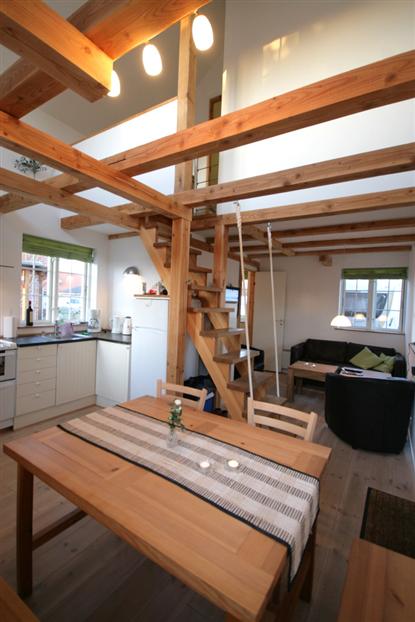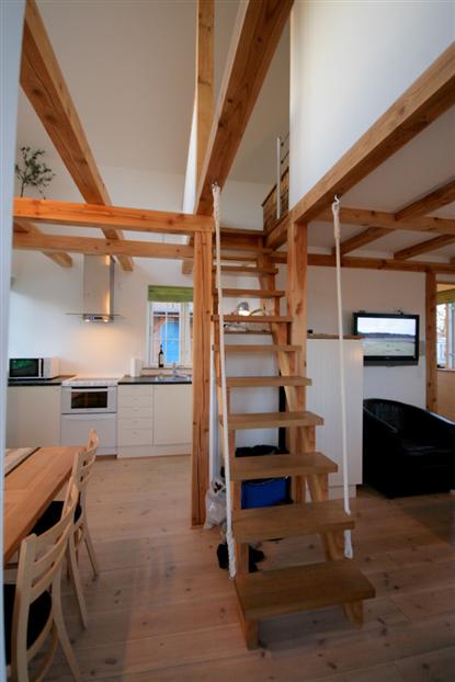 Trots att campingstugor bara får vara 25 kvm stora (det pågår förhandlingar om en utökning till 35 kvm, red.), har man fått plats med mycket. Sovrummen med takhöjd upp till nock känns rymliga och luftiga, och i det ena finns det till och med plats för en byrå för förvaring. Från loftet ? som ger tillgång till båda sovrummen ? har man utsikt ner genom våningsplanet till bottenvåningen och köket. En vacker detalj!