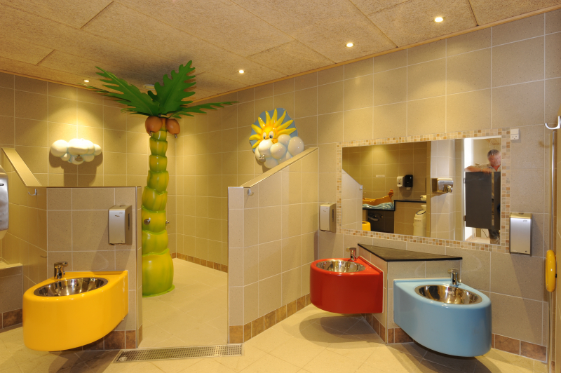Mitt på vår halvö hittar du, förutom lekplatser och pool med vattenrutschbanor och barnbassäng, även huvudbyggnaden med kiosk, grillbar, kök, sällskapsrum och moderna toalettutrymmen med familjerum och en barnavdelning som är mycket populär bland de små.