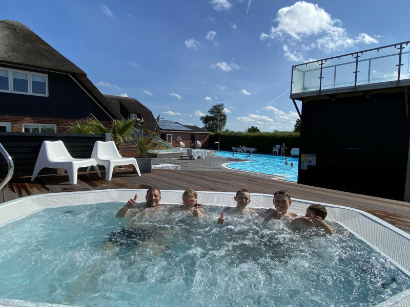 Stort spabad för 14 personer med en härlig temperatur på hela 37 grader. Från spabadet kan du njuta av utsikten över poolområdet, och på spaterrassen kan du sola och koppla av.