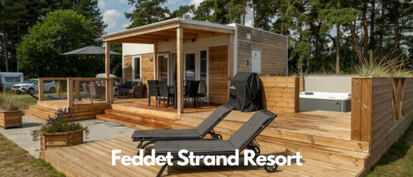 På Feddet Strand Resort kan du hyra ett spa-mobilhem och få lite extra lyx på din campingsemester. Här finns sovplatser för fyra vuxna och två barn – och utomhus finns en stor terrass med egen utomhusspa. På terrassen hittar ni även en gasolgrill med fri gas.