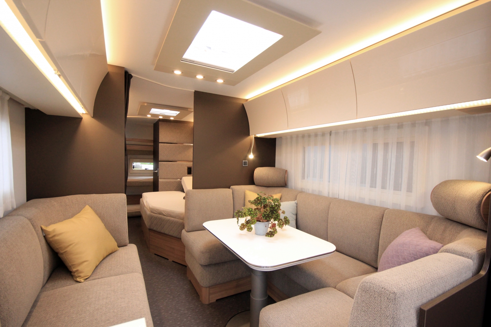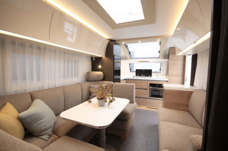 Hörnköket och loungen i den främre delen av vagnen är hämtade från den populära 663 HT. Man blir med andra ord bortskämd med ett topputrustat kök som även har gasugn, och arbetsytan är närmast överdådig. Dessutom har man bästa utsikten genom sky-light-fönstret när man trollar i köket.