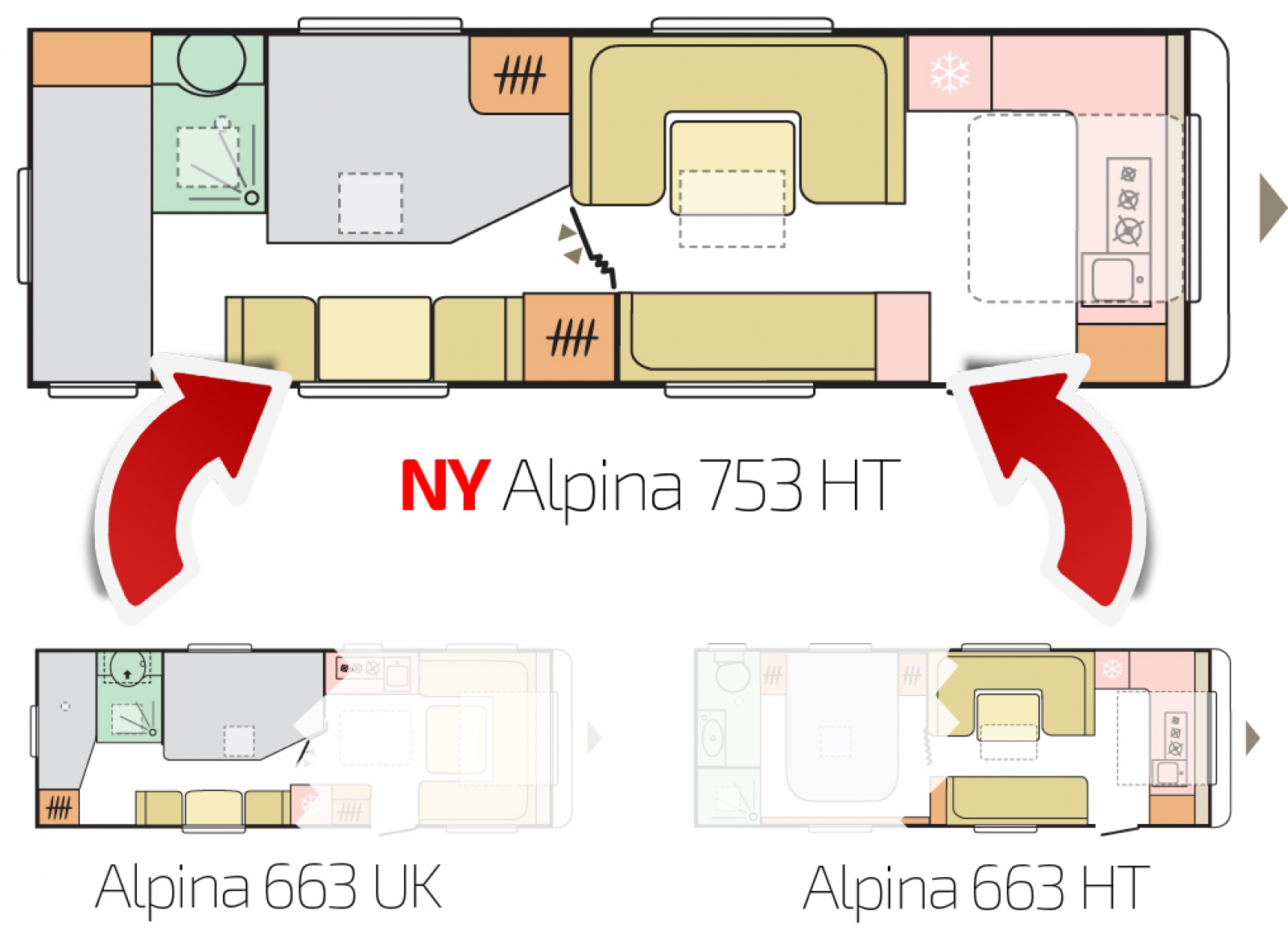 De två populära planlösningarna ligger till grund för en ny planlösning 2019 – den nya stora Alpina 753 HK. Man har helt enkelt tagit det bästa från båda modellerna och det har resulterat i en helt ny planlösning.