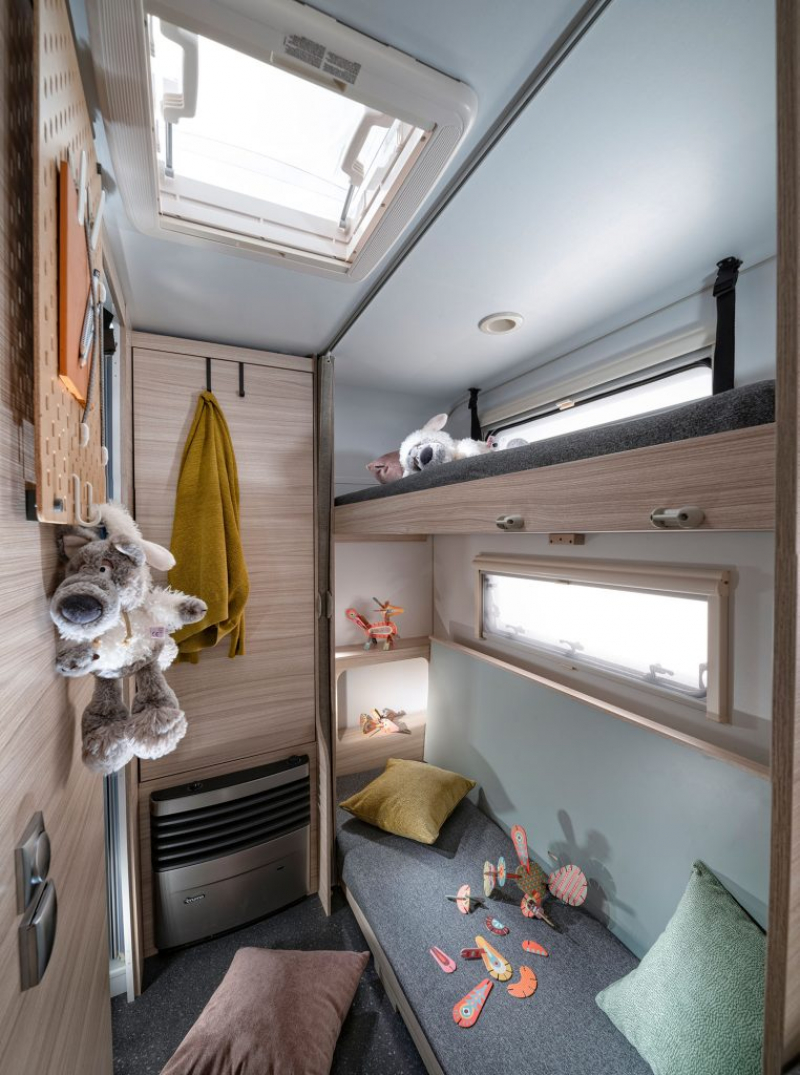 Sängskyddet i övre kojen har blivit vadderat… Den mellersta kojen kan fällas ner och förvandlas till en tavla som barnen kan rita på…