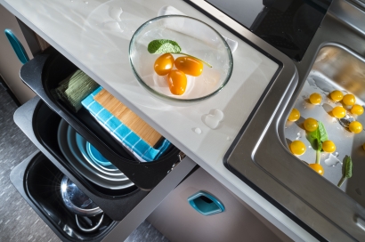 Även köket har fått det nya förvaringssystemet som fungerar som ”lådor” och därmed är lätta att ta med sig – till exempel när man diskar i campingplatsens kök.