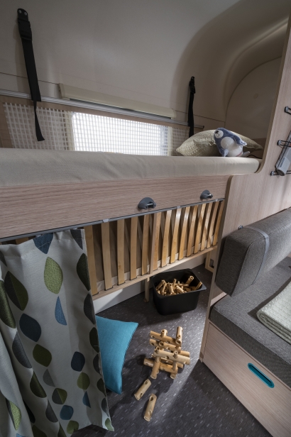 Den nedersta köjen längst bak i vagnen kan fällas upp. Madrassen flyttas från köjen ner på golvet och då blir det ”kojakänsla” för familjens minsta med högt i tak.