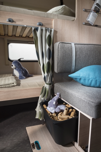Under sofforna döljer sig en lucka med samma typ av förvaringslådor som finns ute i gasolkassen. Fyll dem med barnens leksaker – så kan de enkelt tas in och ut ur vagnen.
