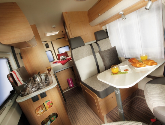 Det finns plats för 4 personer under färd, men om man får gäster kan man faktiskt bädda för upp till 6 sovplatser totalt. Precis som hos de andra modellerna är husbilen ljust och trevligt inredd.