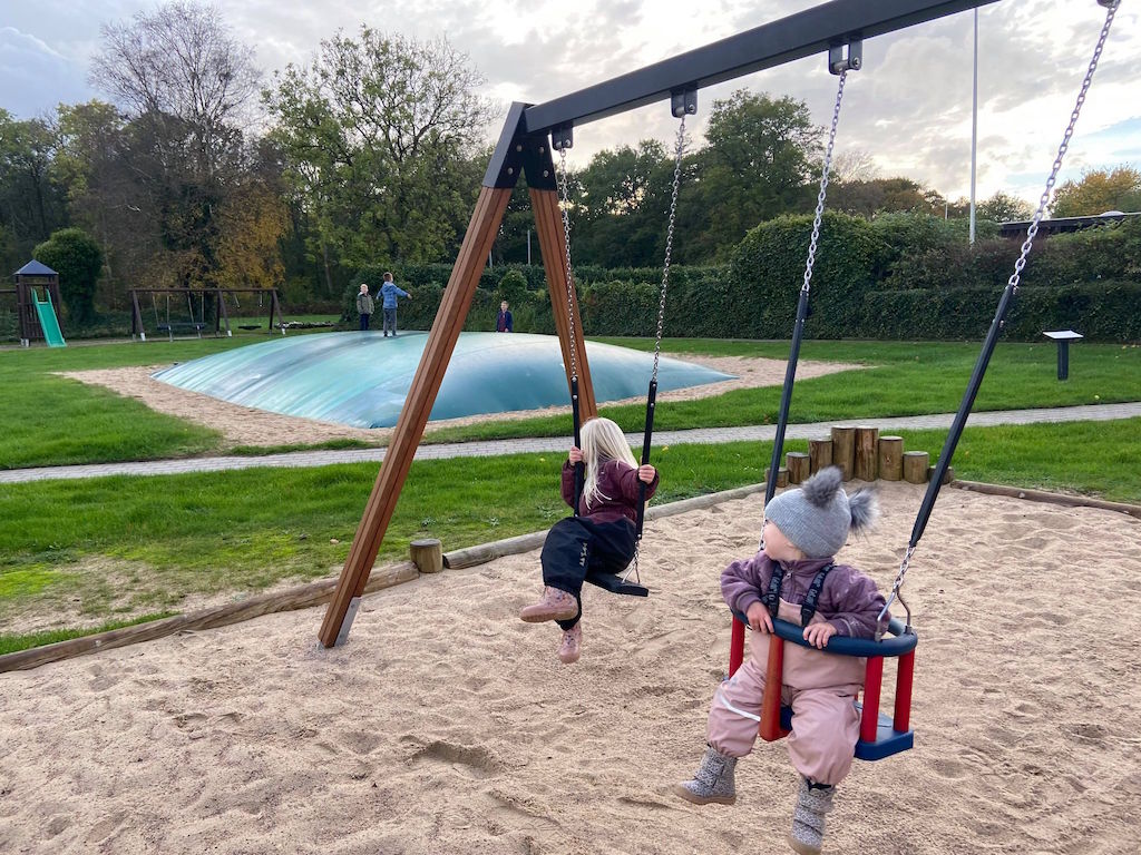 Dessutom finns det två hoppkuddar, gungor, fågelbo, klättertorn, vattenhjul, rutschkana, stor sandlåda, mooncars m.m.